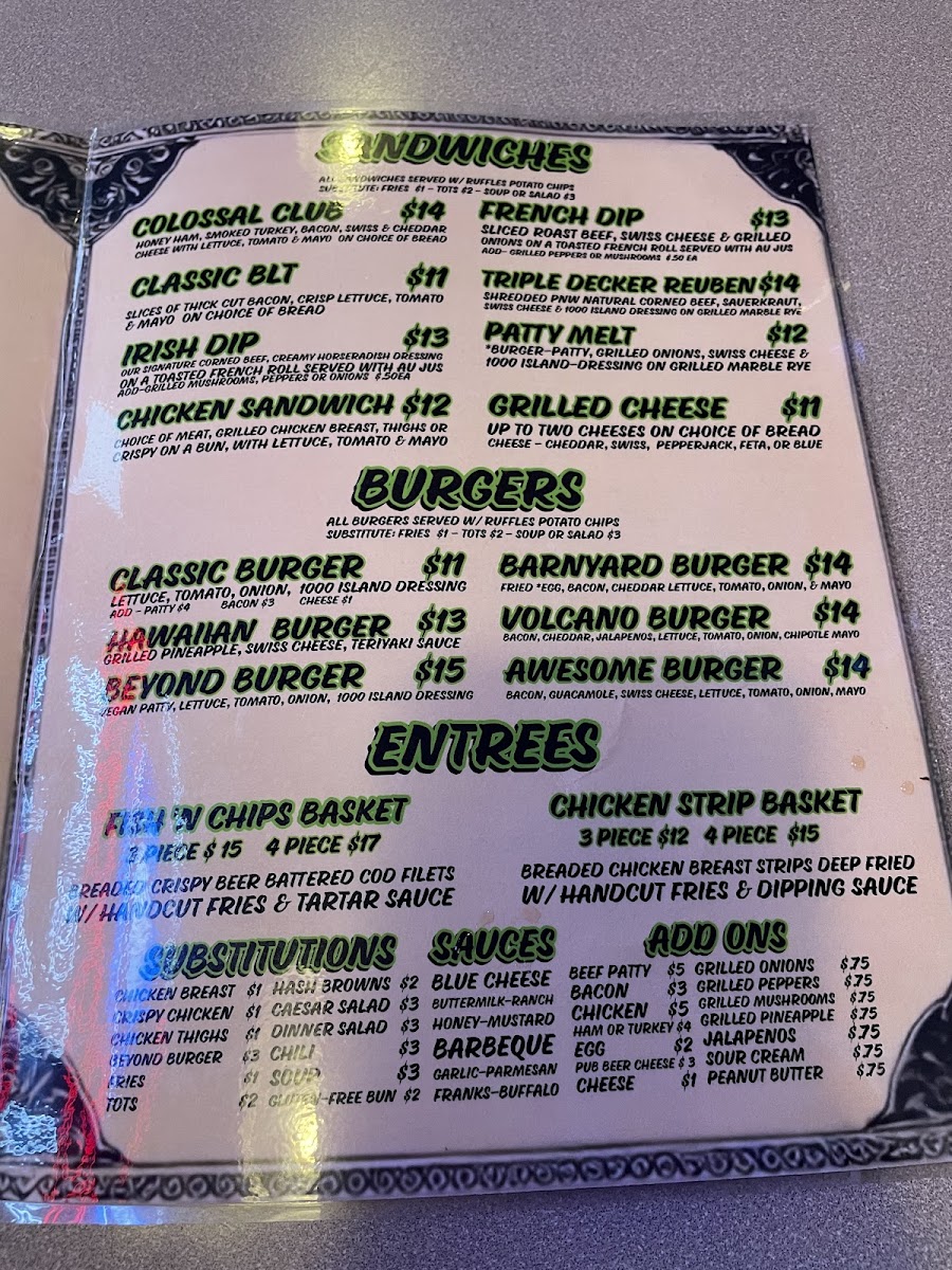 The menu features classics like juicy burgers, satisfying sandwiches, and familiar pub favorites such as the barnyard and volcano burgers, or the Reuben and French dip sandwiches. For morning or brunch visits, choices like steak and eggs or Katie’s corned beef breakfast provide a filling start, while the variety of appetizers—from monster chicken wings to a simple hummus plate—makes for great shareable moments.